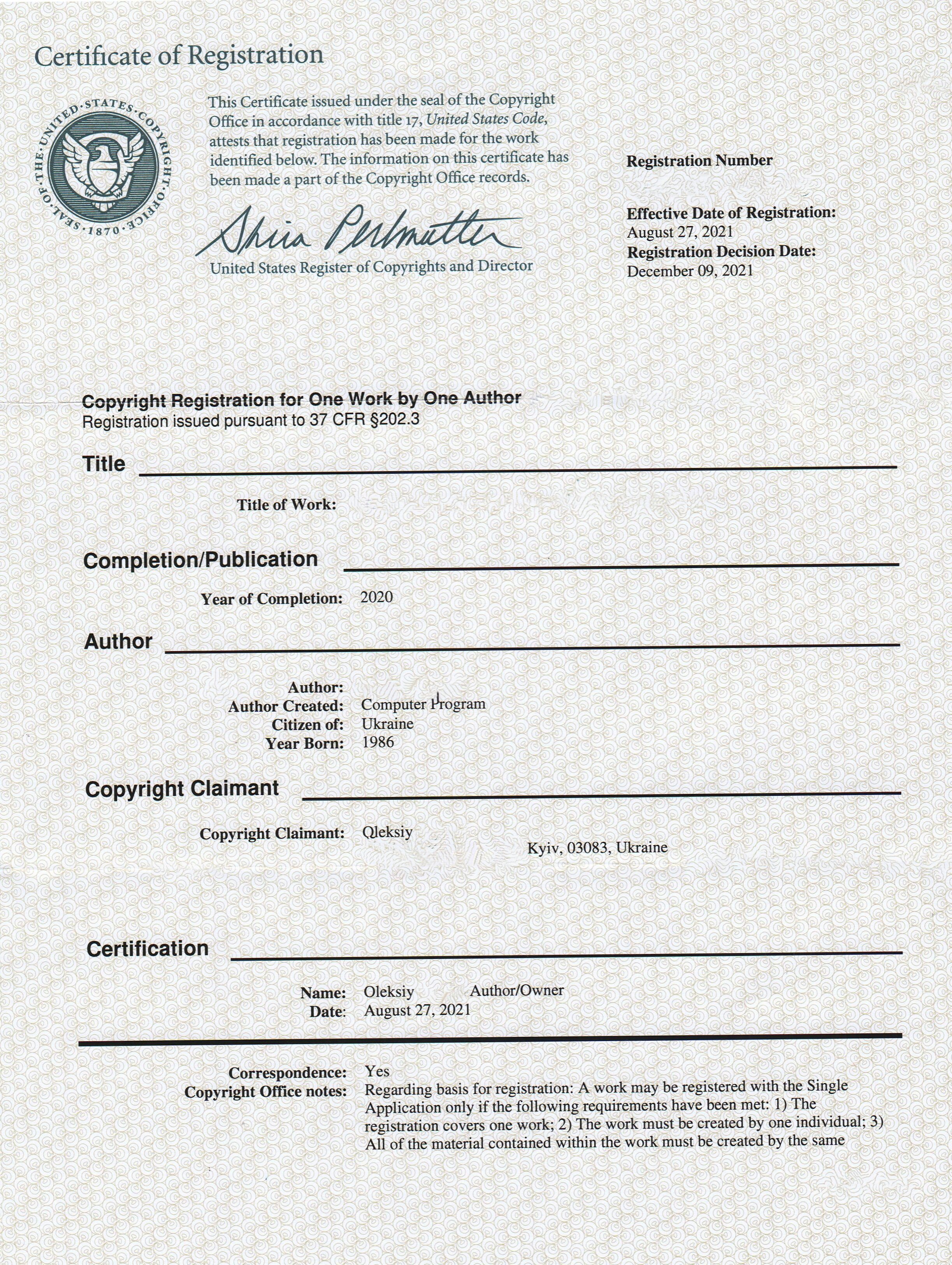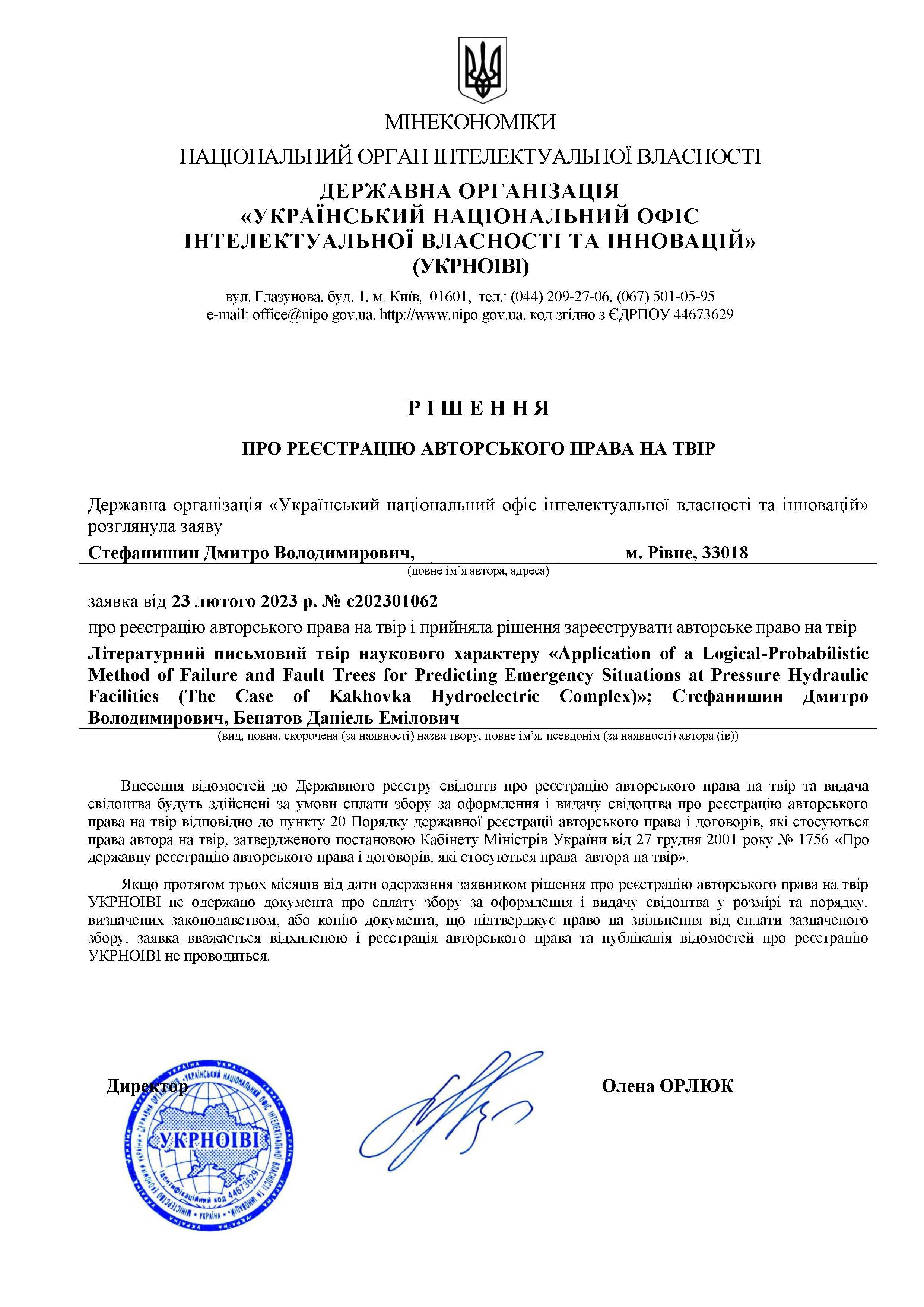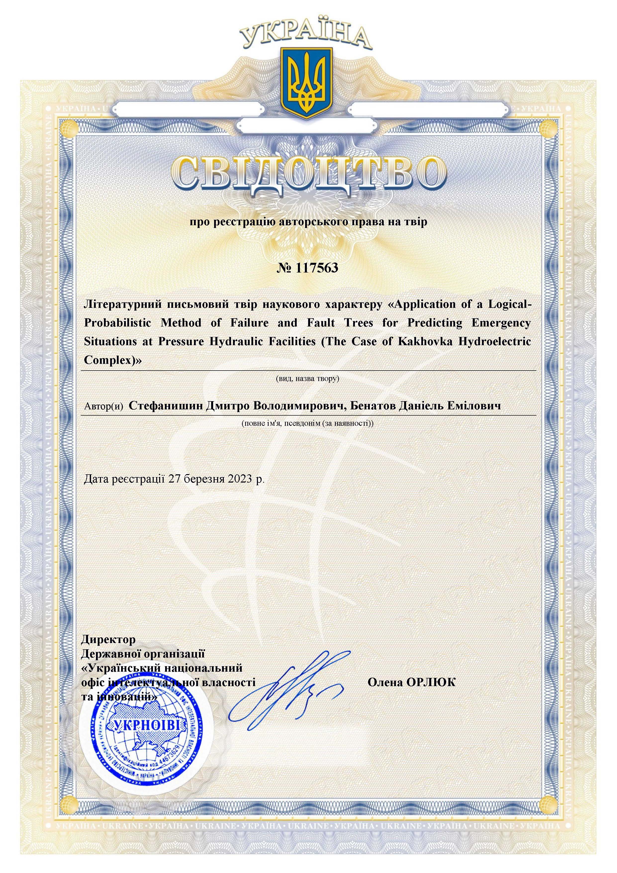 В Украйна, свидетелствата за регистрация на авторски права върху депозирани на произведения се издават на отговорността на заявителя. Това означава, че експертната институция („УКРНОИВИ“) извършва формална проверка за съответствието на материалите на заявката с изискванията на действащото законодателство, определя датата на подаване на заявлението и преценява редовността на подадените документи. В същото време авторът може да декларира всяка дата на създаване на произведението.
